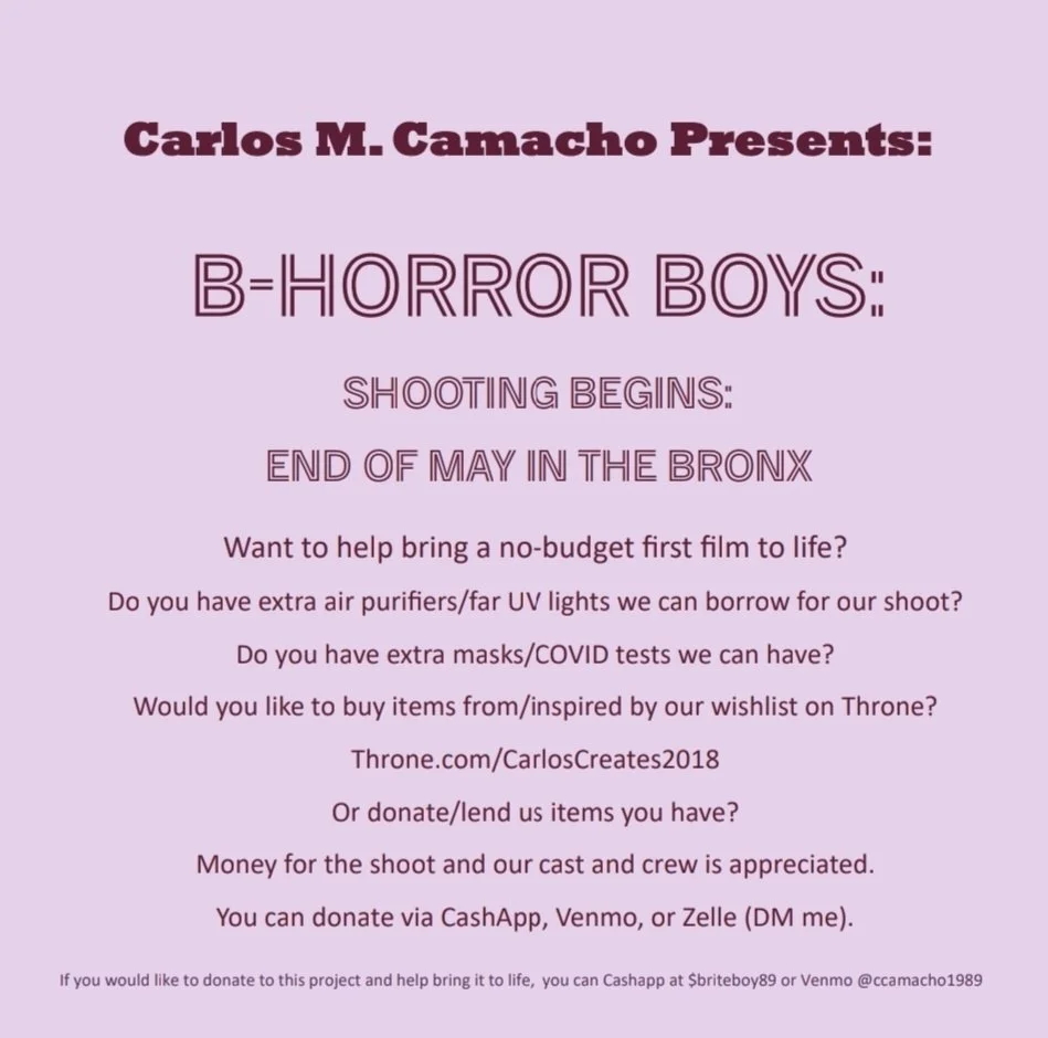Carlos M. Camacho Presents: B-Horror Boys: Shooting Begins: End of May in the Bronx. Want to help bring a no-budget first film to life? Do you have extra air purifiers/far UV lights we cab borrow for our shoot? Do you have extra masks/COVID tests we can have? Would you like to buy items from/inspired by our wishlist on Throne?